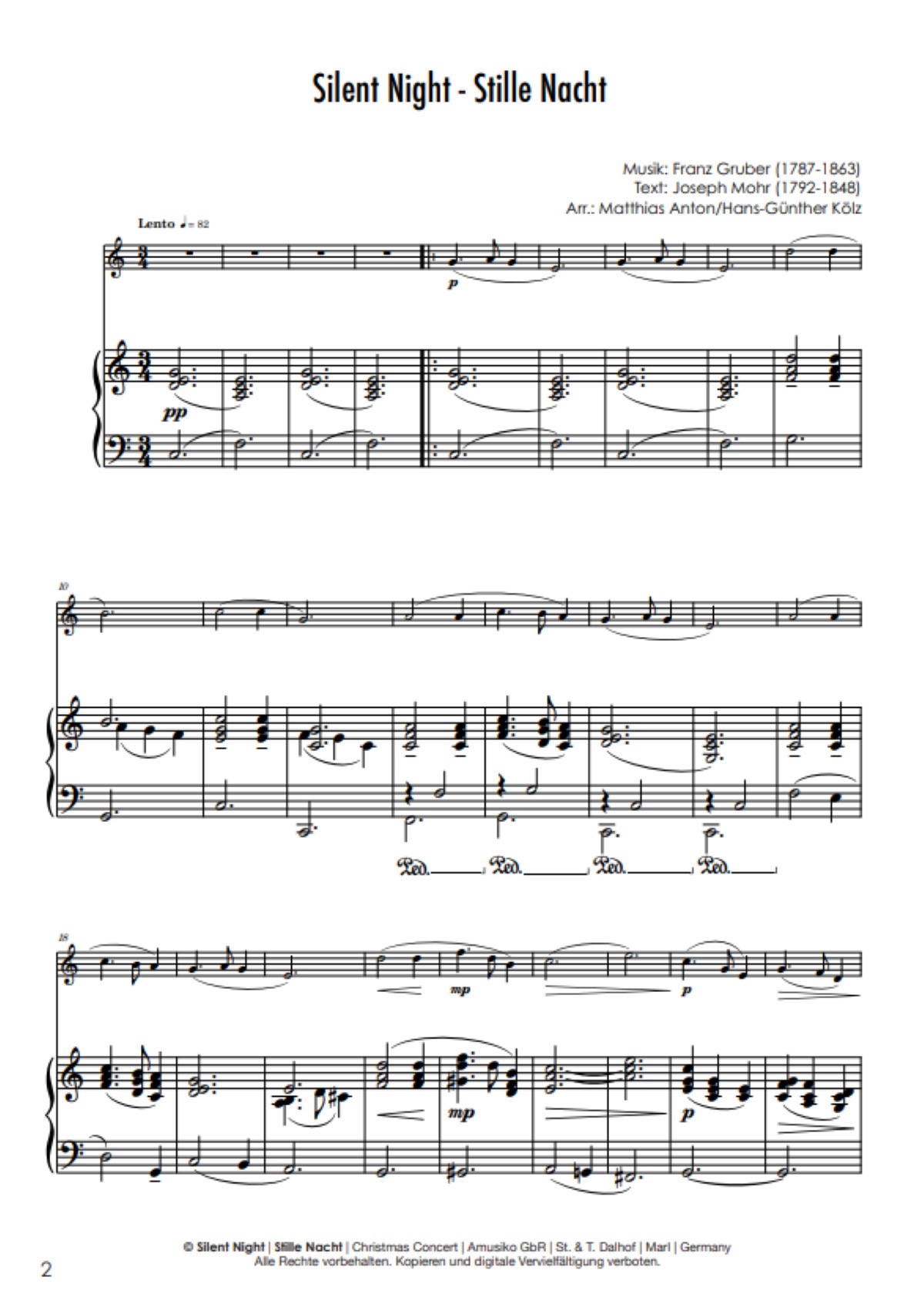 Matthias Anton und Hans-Günther Kölz haben das wohl bekannteste Weihnachtslied Silent Night/Stille Nacht für Melodieinstrument in C, Bb, oder Eb und Klavier arrangiert.