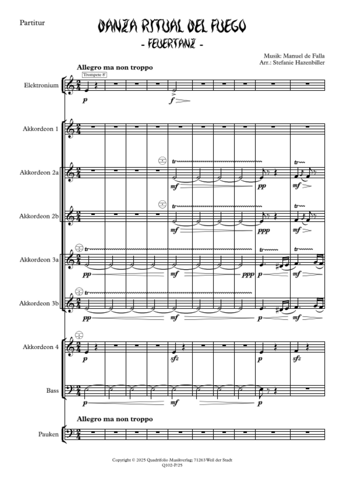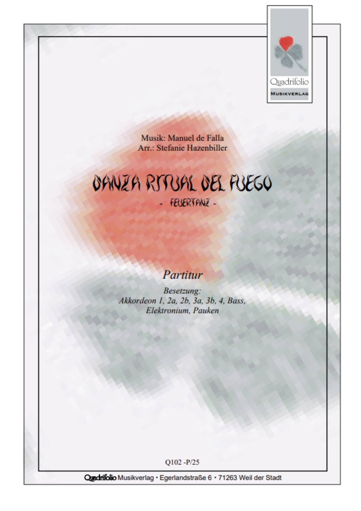 "Danza Ritual del Fuego" ist ein Satz aus dem Ballett "El Amor Brujo" (Die verzauberte Liebe) des spanischen Komponisten Manuel de Falla. Populär wurde das Stück durch das Klavierarrangement des Komponisten. Es wurde auch von der traditionellen, religiösen Zeremonie des Feuertanzes beeinflusst; einem Tanz, der dazu diente, den Feuergott zu verehren. Stefanie Hazenbiller hat dieses Stück meisterhaft für Akkordeonorchester arrangiert.