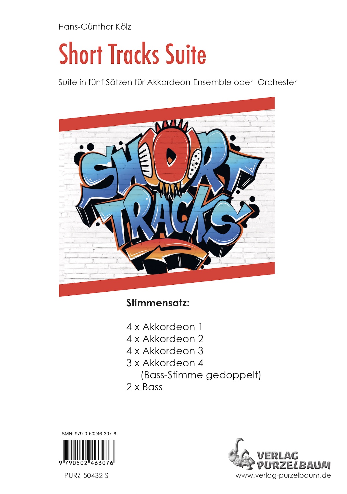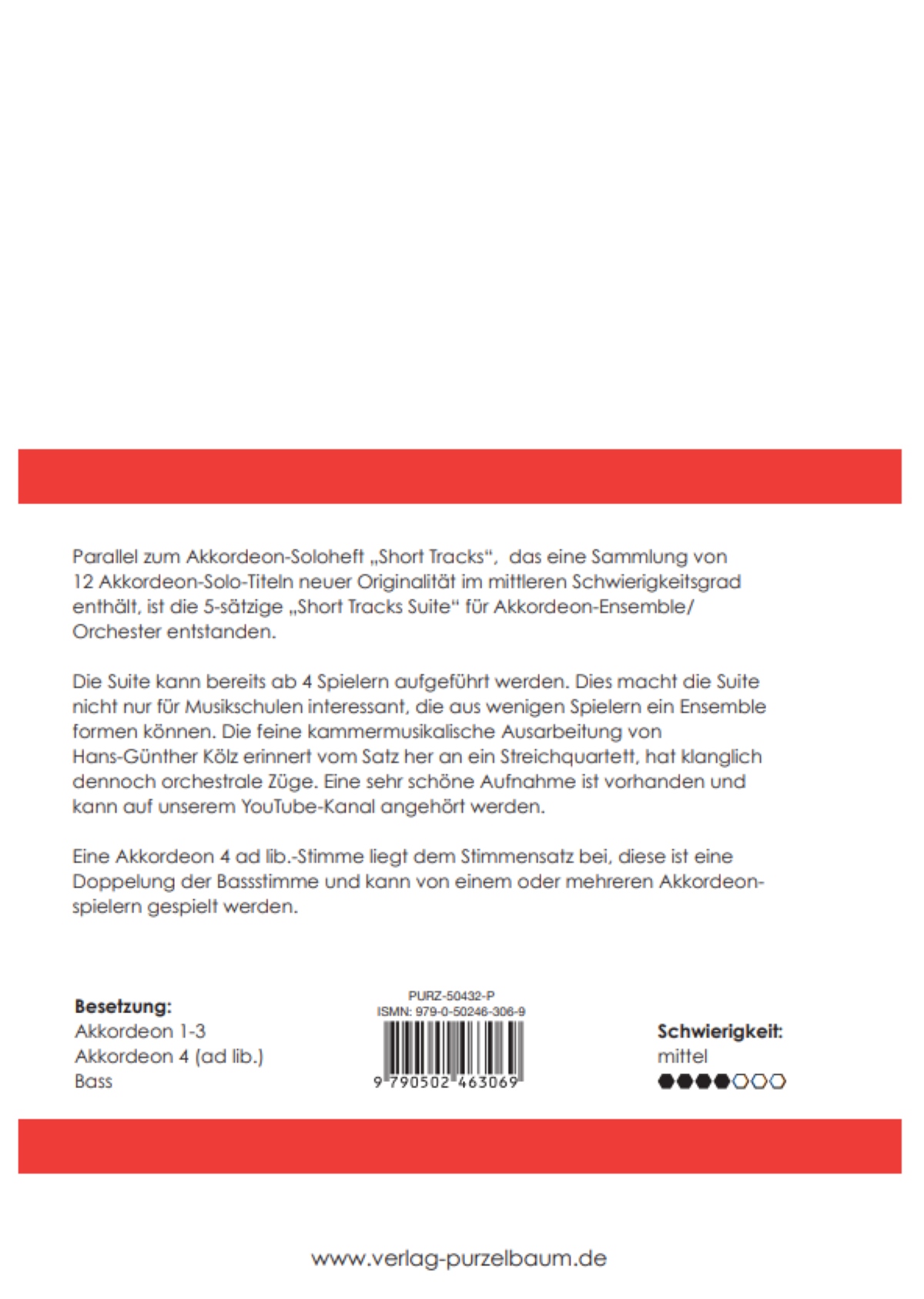 Parallel zum Akkordeon-Soloheft „Short Tracks“, das eine Sammlung von 12 Akkordeon-Solo-Titeln neuer Originalität im mittleren Schwierigkeitsgrad enthält, ist die 5-sätzige „Short Tracks Suite“ für Akkordeon-Ensemble/-Orchester entstanden.