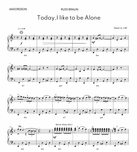 Today I Like to Be Alone ist ein witziges, fröhliches Stück in Moll mit raffinierten Akkordwechseln, Tempoänderungen, Bellowshake sowie quirligen Passagen. Ein Stück mit außergewöhnlichem Charakter, das etwas aus dem Rahmen der einschlägigen Akkordeon-Literatur fällt. Gerade deshalb ist es besonders für Vorspiel, Konzert und Wettbewerb geeignet.